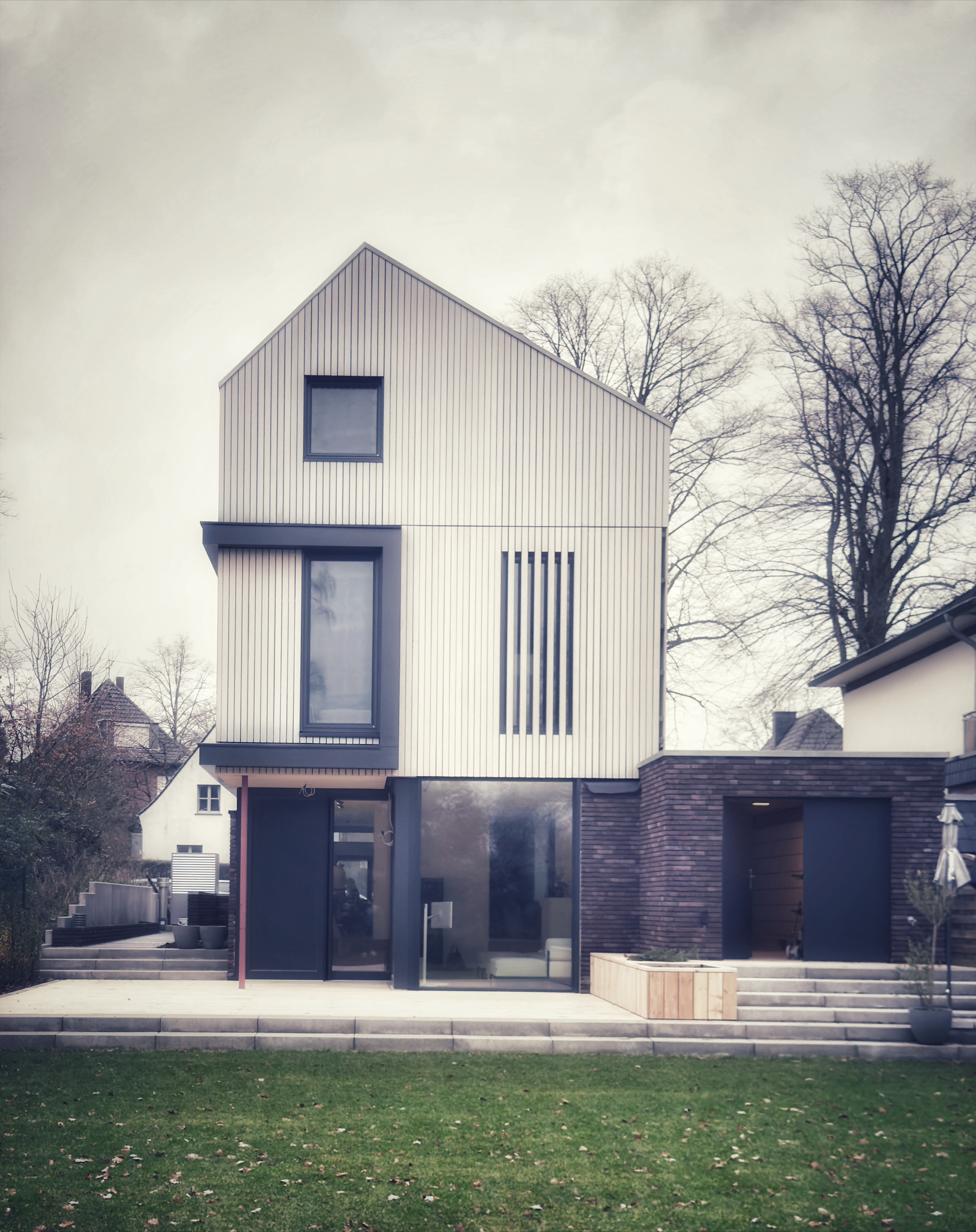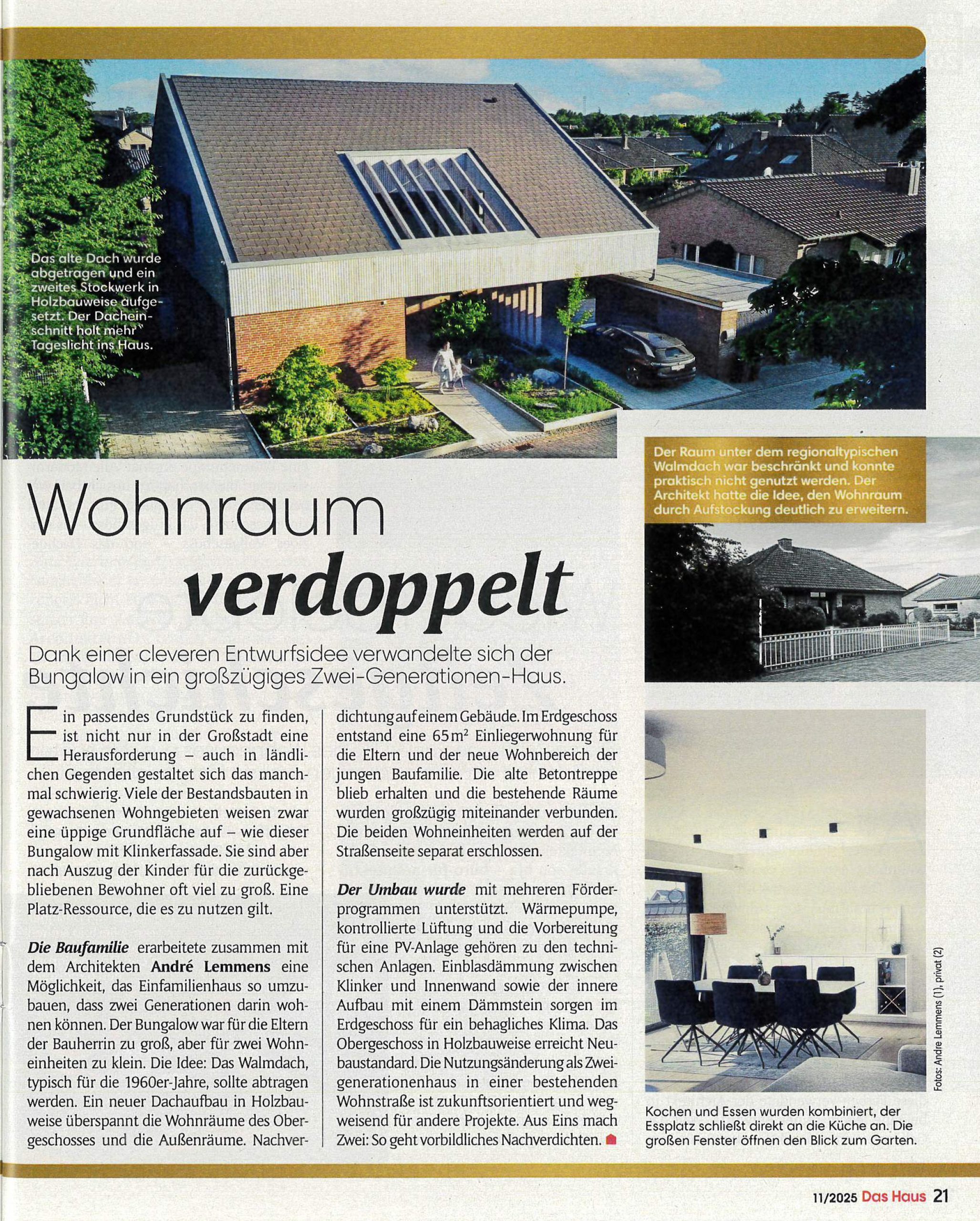 Für die gelungene Umwandlung eines Bungalows in ein modernes Zwei-Generationen-Haus erhielten wir eine Anerkennung beim „Goldenen Haus 2025“ von Das Haus. Die ausgezeichnete Lösung: Das alte Dach wich einer Aufstockung in Holzbauweise, die den Wohnraum verdoppelte. So entstanden zwei separate Wohneinheiten für die junge Familie und die Eltern. Das Projekt steht für vorbildliche Nachverdichtung, Energieeffizienz und zukunftsweisendes, generationsübergreifendes Wohnen