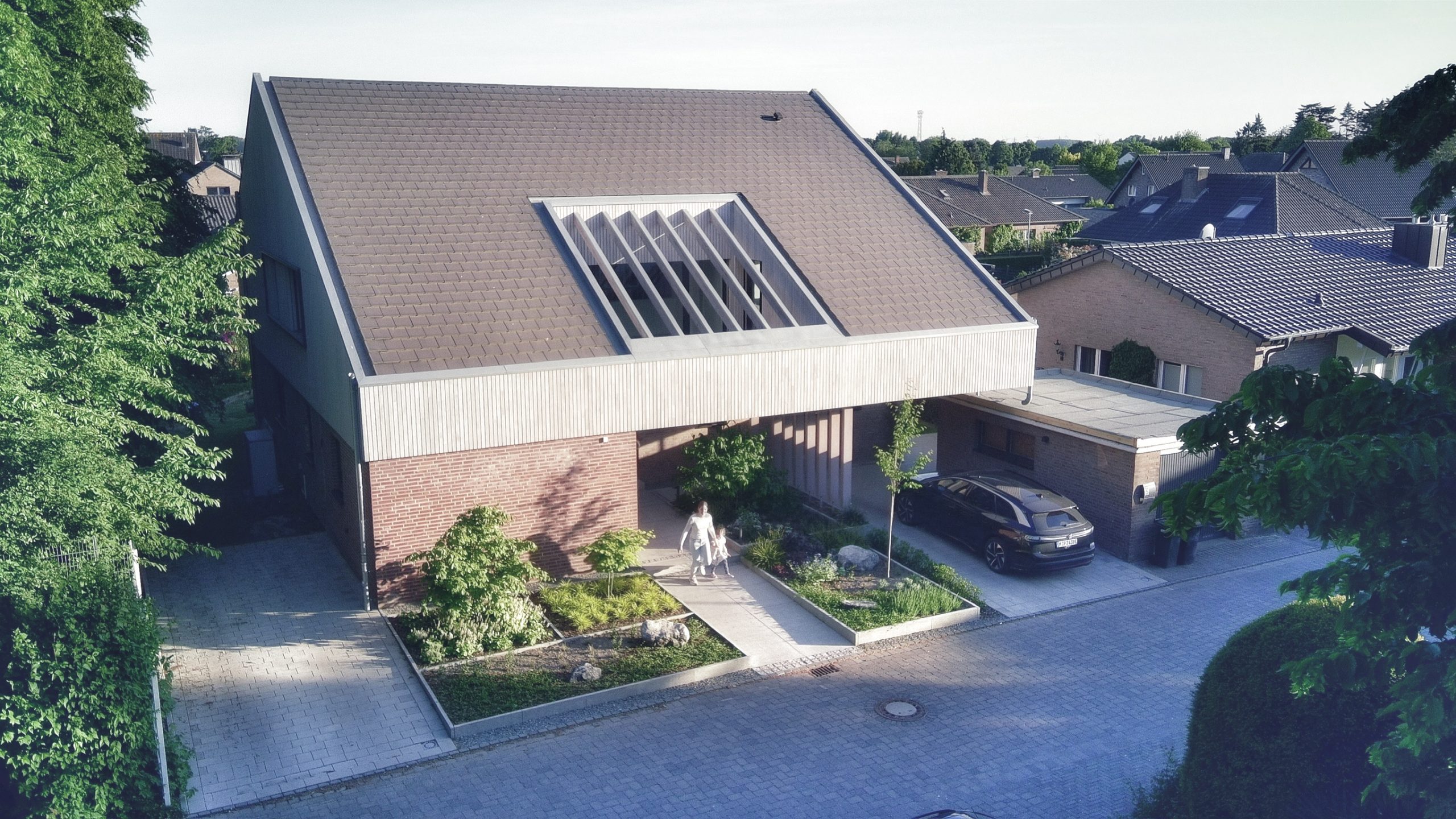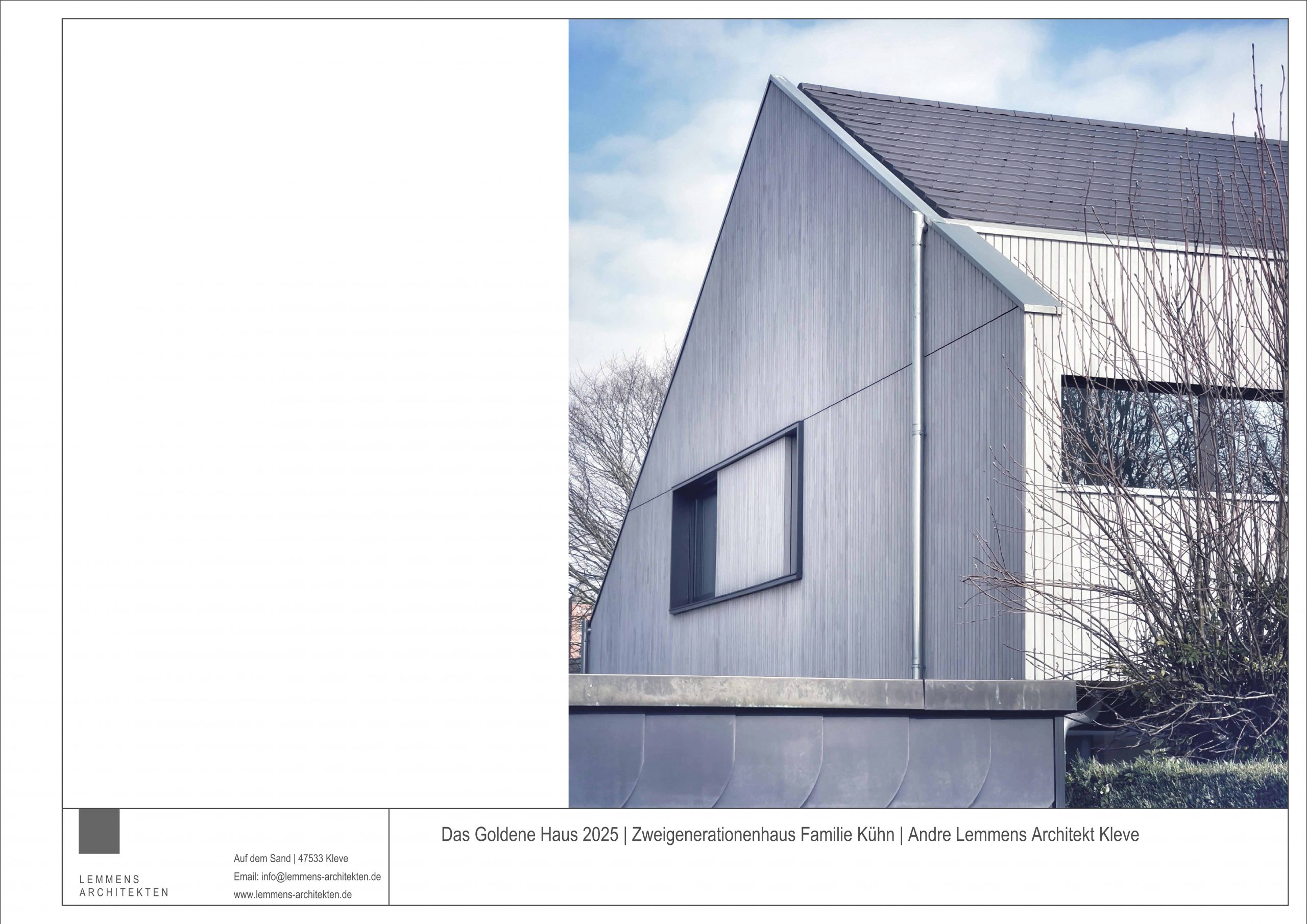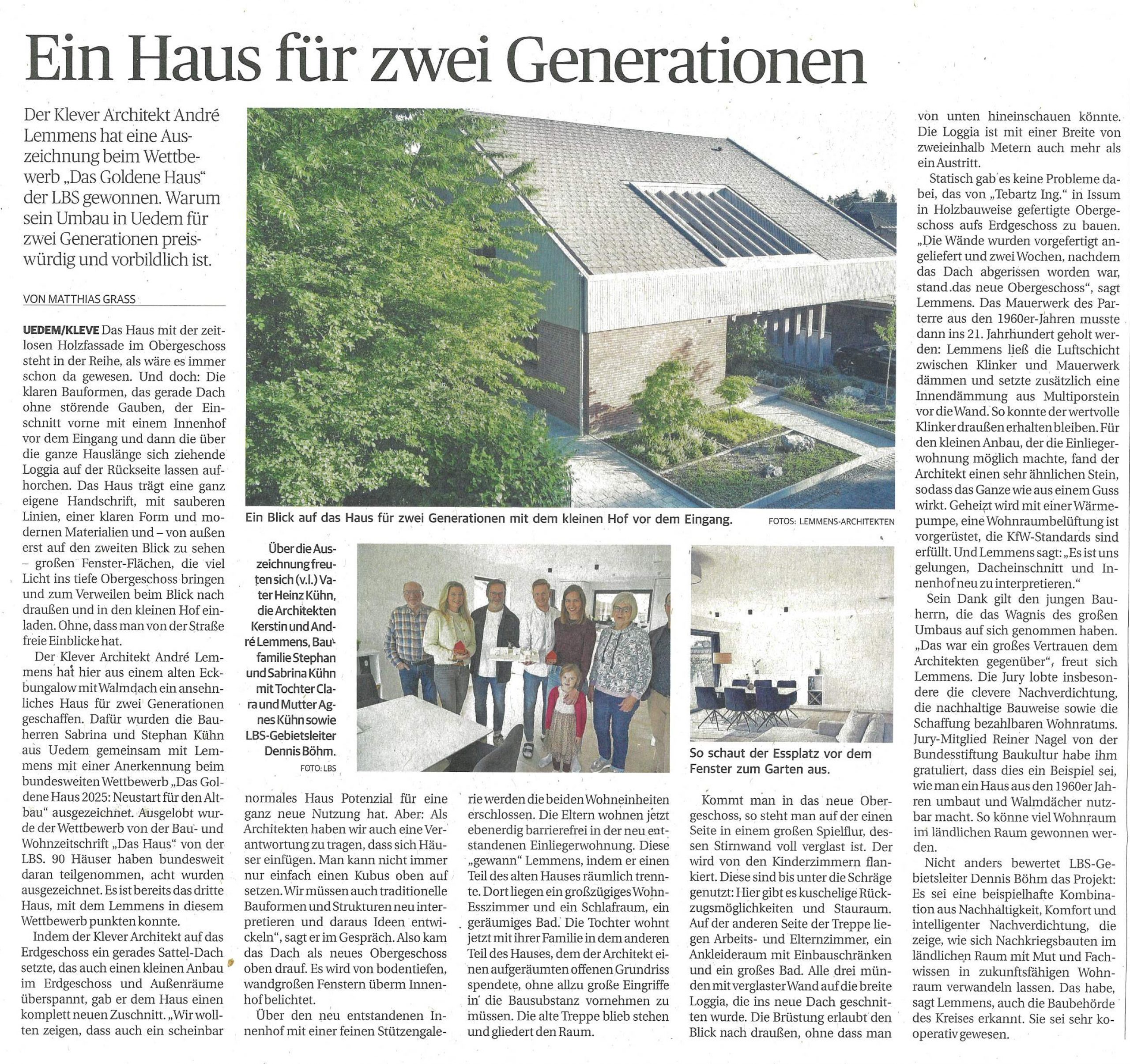 Für die gelungene Umwandlung eines Bungalows in Uedem zu einem modernen Zwei-Generationen-Haus erhielten wir eine Anerkennung beim Wettbewerb „Das Goldene Haus“. Architekt André Lemmens schuf durch eine clevere Aufstockung in Holzbauweise zusätzlichen Wohnraum, der sich harmonisch in das Straßenbild einfügt.